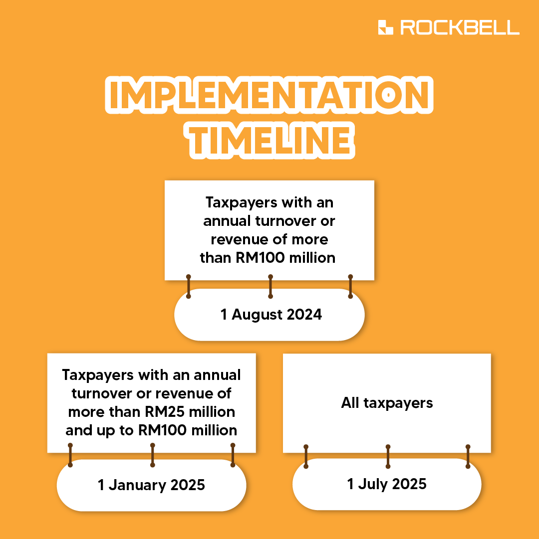 Taxpayers with an annual turnover or revenue of more than RM100 million will begin implementation on 1st August 2024 as the first batch. Those taxpayers with an annual turnover or revenue of more than RM25 million and up to RM100 million will start on 1st January 2025, while the rest of the businesses will implement it on 1st July 2025.